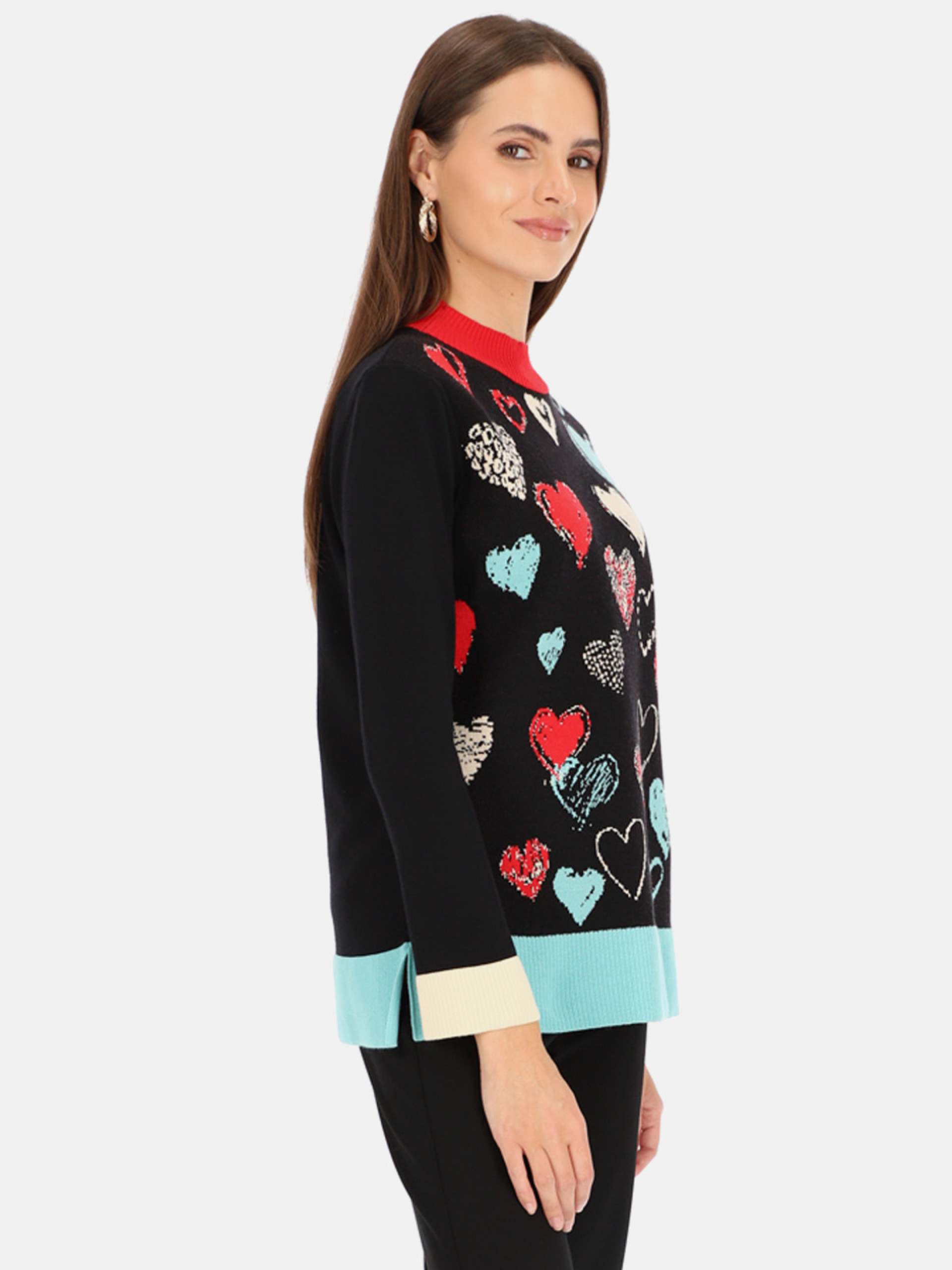 W sezonie jesień-zima 2024/2025 na topie będą również swetry zachwycające barwnymi, oryginalnymi wzorami i żywymi kolorami. Im ciekawszy i bardziej kolorowy motyw, tym lepiej – taka stylizacja od razu zyskuje wyrazu! Takie propozycje można połączyć z wieloma elementami garderoby w bardziej stonowanym klimacie – np. z klasycznym trenczem, prostymi dżinsami czy czarną lub denimową spódnicą. Idealnym przykładem kolorowego swetra, który pozwala zapomnieć o nudzie w ubiorze, jest model Eira marki Tinta dostępny w naszej ofercie. Wzór w postaci różnokolorowych, mniejszych i większych serc od razu wyróżnia się na tle czerni – to świetny sposób na ożywienie stylizacji i dodanie jej uroku. Charakteru nadaje mu również wykończenie rękawów, kołnierzyka oraz dołu swetra w trzech różnych kolorach.