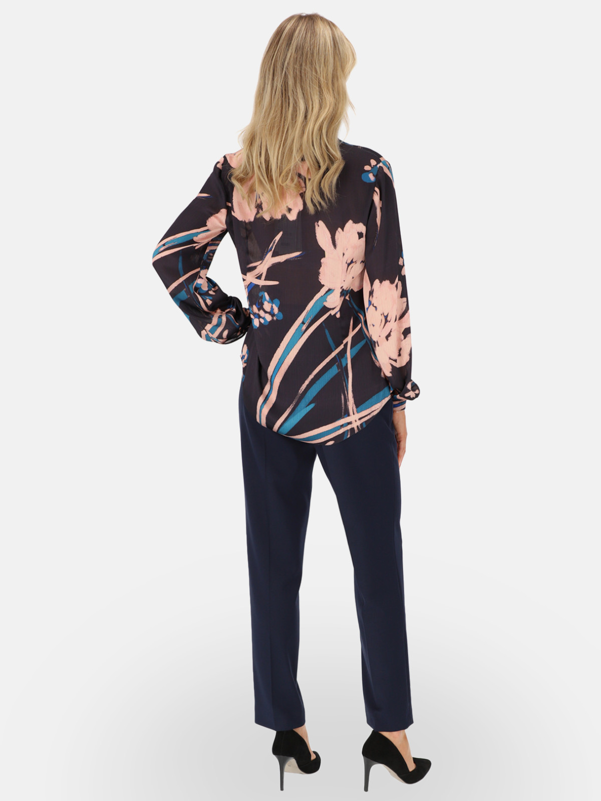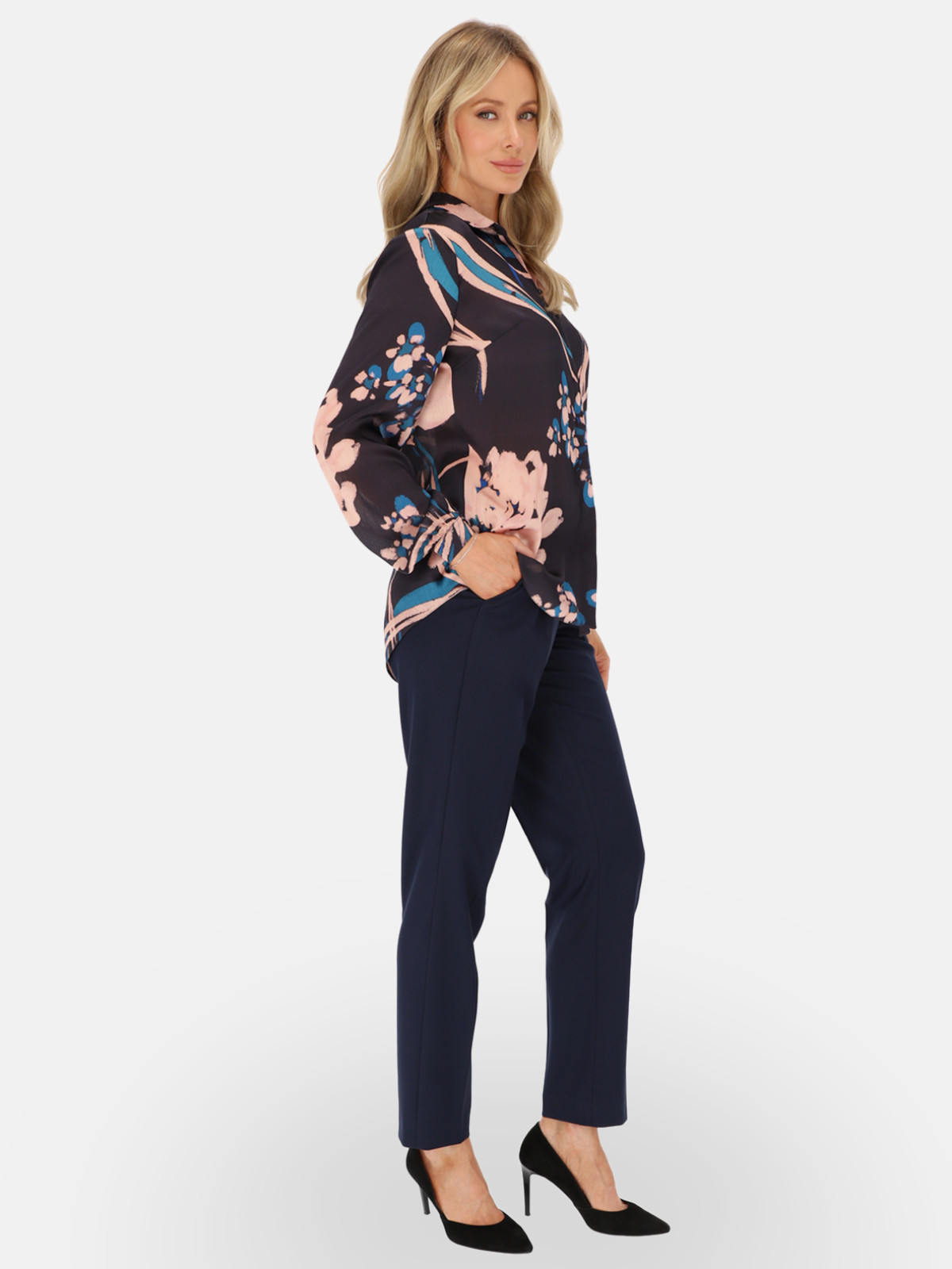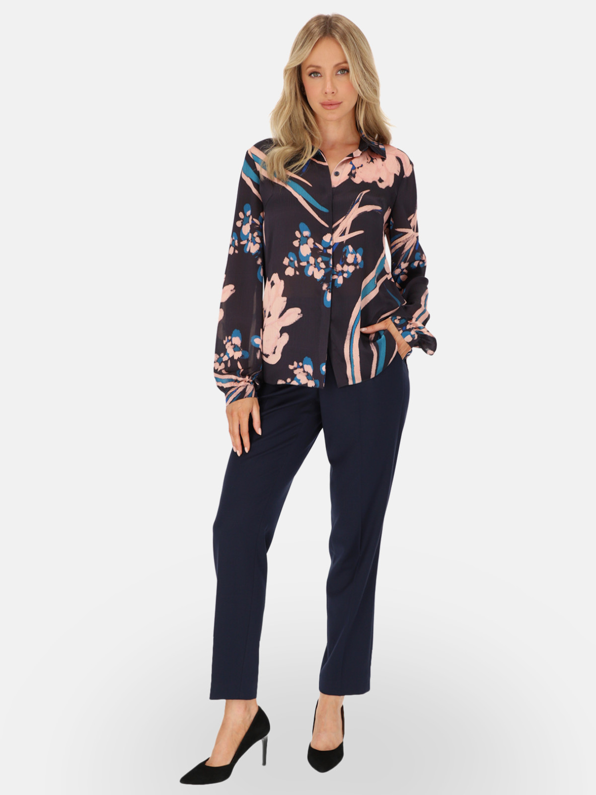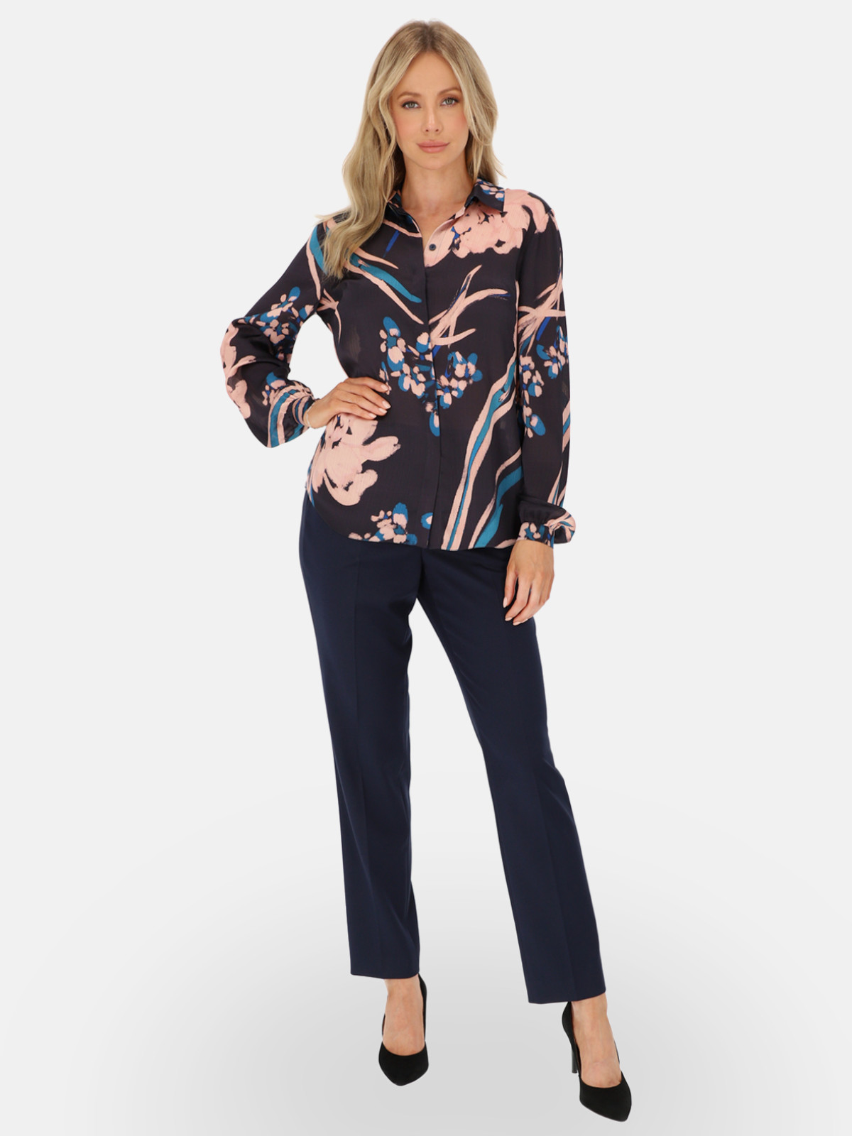 Koszula Kaila od L’AF to propozycja dla kobiet, które cenią elegancję i swobodę ruchu. Model wykonany z lekkiej, miękko układającej się tkaniny zachwyca malarskim, kwiatowym printem w odcieniach granatu, pudrowego różu i turkusu. Klasyczny kołnierzyk koszulowy, kryta listwa guzikowa oraz długie rękawy zakończone mankietami nadają bluzce szlachetny charakter, dzięki czemu świetnie sprawdzi się zarówno w biurze, jak i po godzinach. To elegancka bluzka, którą z łatwością wystylizujesz do spodni w kant, ołówkowej spódnicy lub ulubionych jeansów – od smart casualu po look na wyjątkowe okazje.