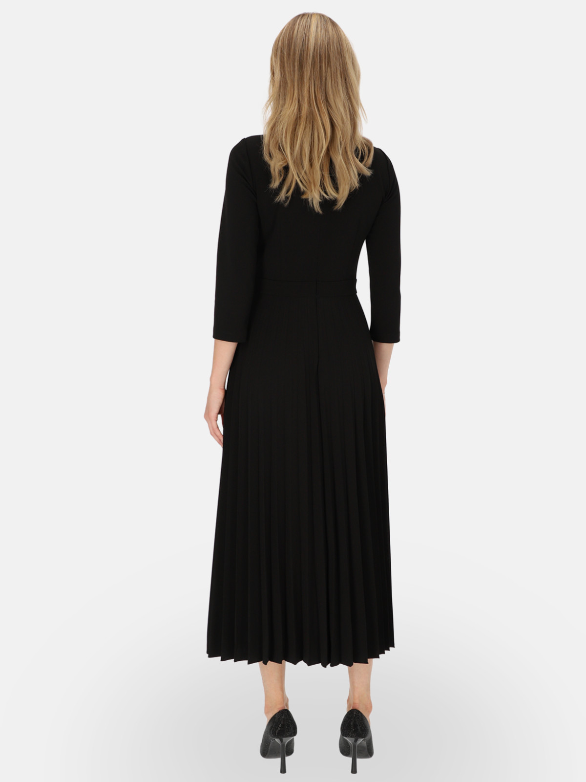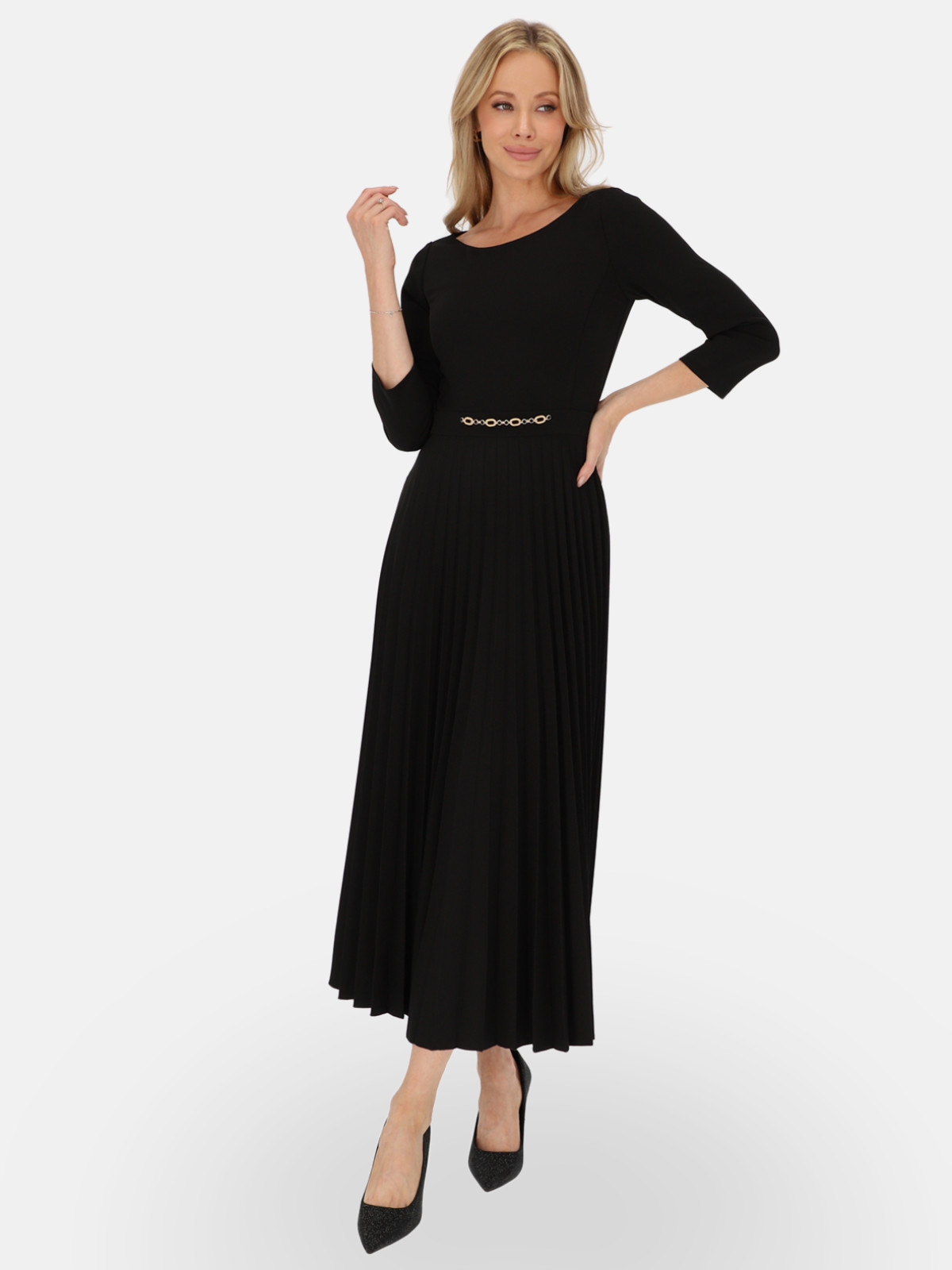 Sukienka Celine od marki L’AF to synonim ponadczasowej elegancji i kobiecego szyku. Wykonana z miękkiej, mięsistej dzianiny, łączy wygodę z wyrafinowanym stylem. Klasyczny czarny kolor dodaje charakteru, a jednocześnie świetnie podkreśla urodę kobiet ceniących klasyczne rozwiązania w modzie. Górna część sukienki o prostym fasonie z okrągłym dekoltem harmonijnie kontrastuje z efektownym, plisowanym dołem, który nadaje sylwetce lekkości i subtelnego ruchu.
