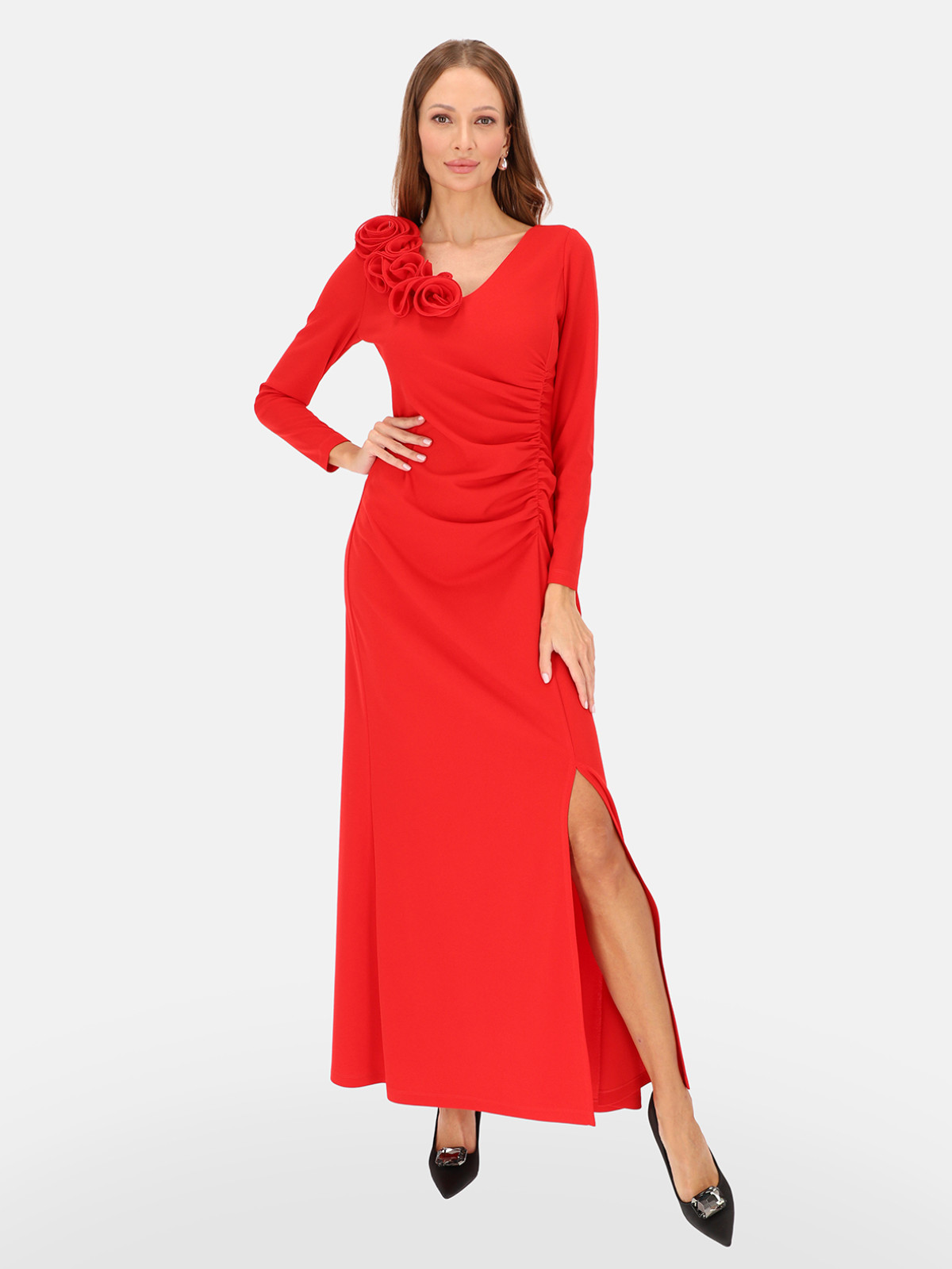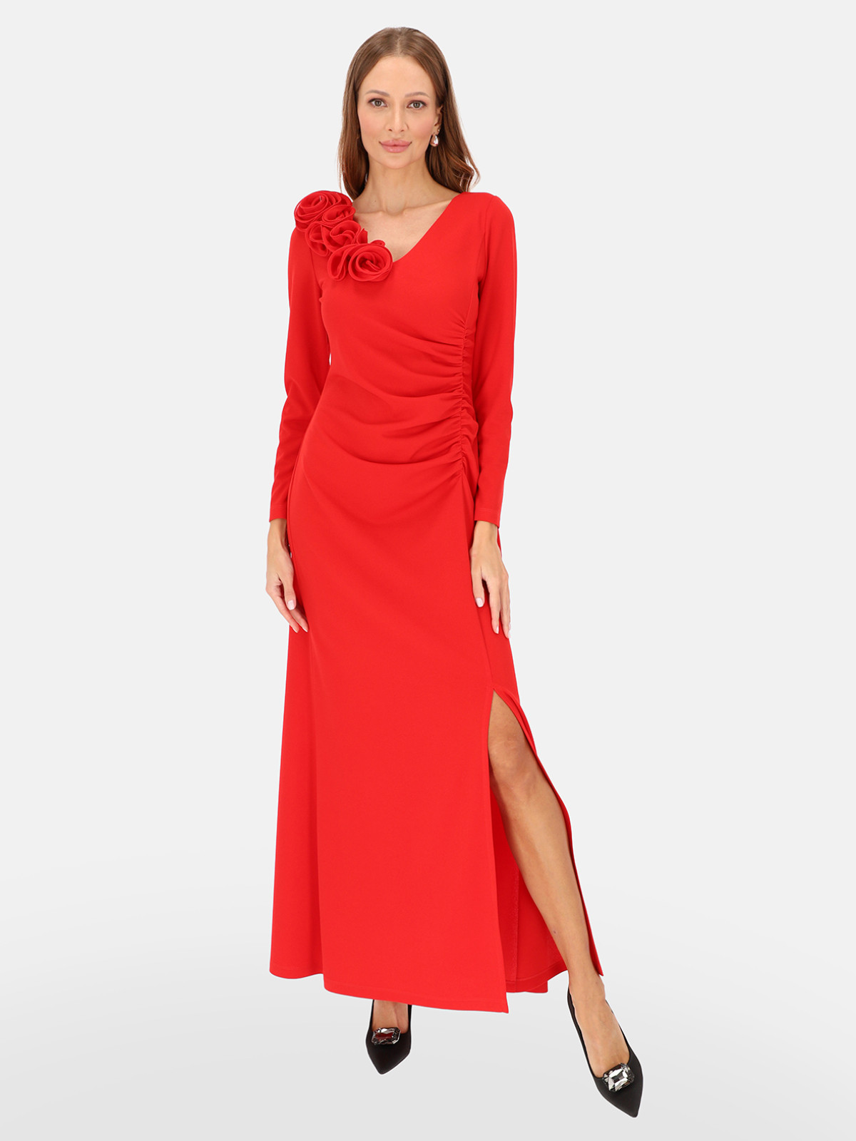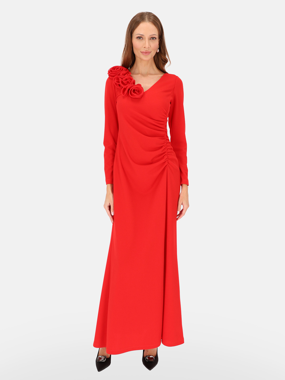 Model L'AF Mara to wyjątkowa długa sukienka wieczorowa, stworzona z myślą o kobietach, które cenią elegancję w czystej formie. Uszyta z wysokogatunkowej dzianiny, zachwyca intensywnym odcieniem czerwieni oraz dopracowanym krojem, który pięknie podkreśla sylwetkę. Model wyróżnia asymetryczna aplikacja kwiatowa 3D na ramieniu oraz subtelne marszczenia, które nadają całości lekkości i klasy.