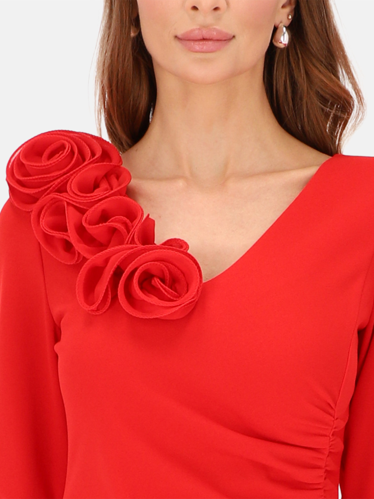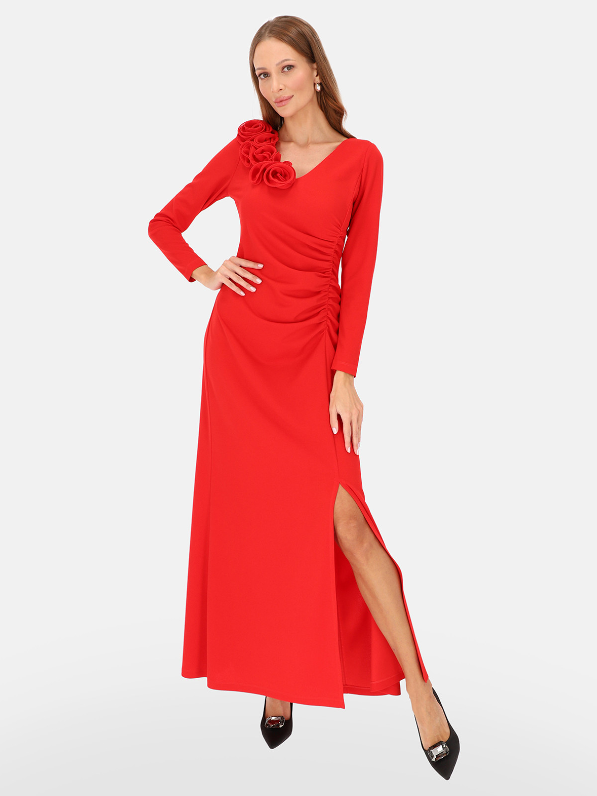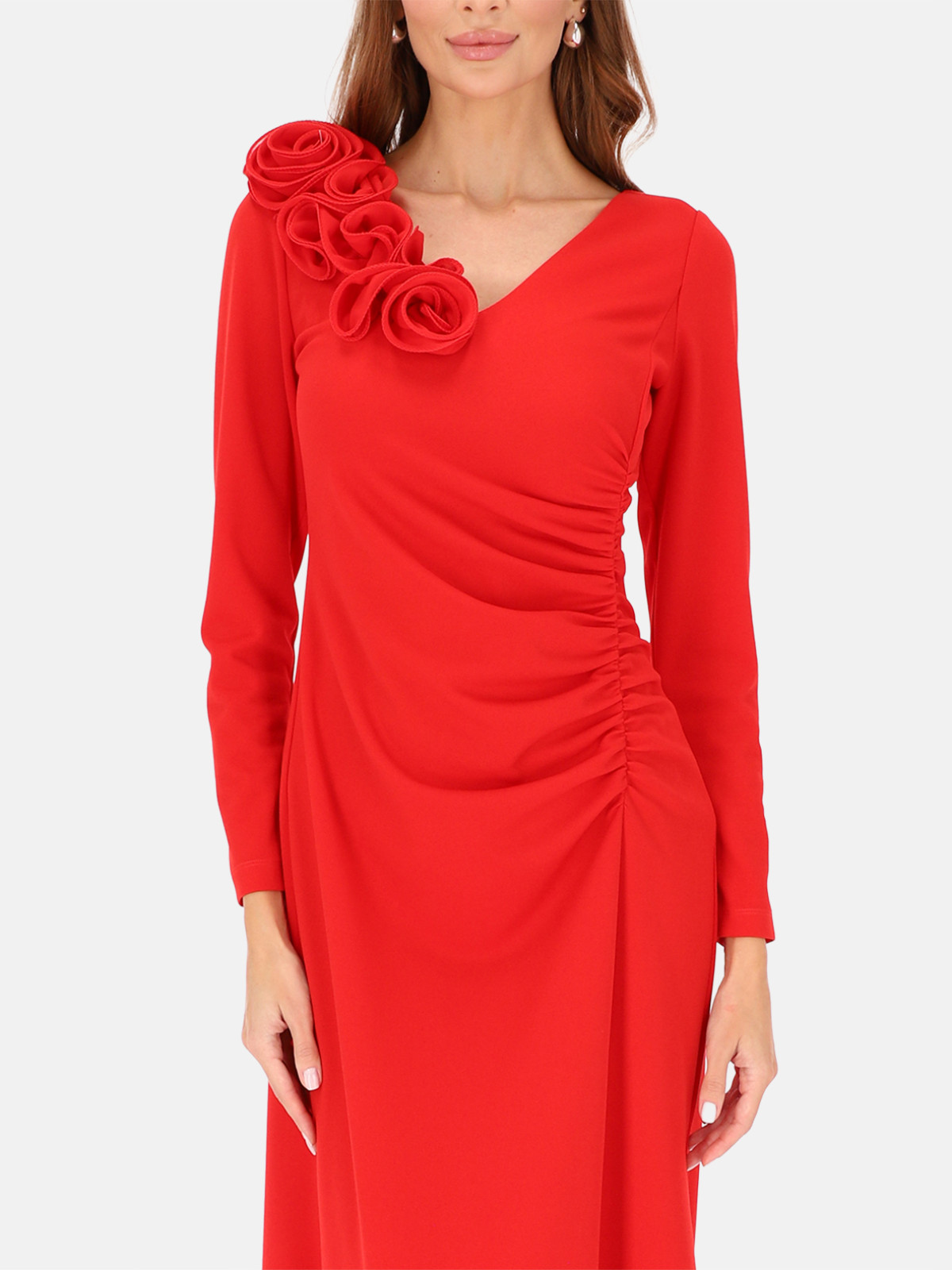 Model L'AF Mara to wyjątkowa długa sukienka wieczorowa, stworzona z myślą o kobietach, które cenią elegancję w czystej formie. Uszyta z wysokogatunkowej dzianiny, zachwyca intensywnym odcieniem czerwieni oraz dopracowanym krojem, który pięknie podkreśla sylwetkę. Model wyróżnia asymetryczna aplikacja kwiatowa 3D na ramieniu oraz subtelne marszczenia, które nadają całości lekkości i klasy.