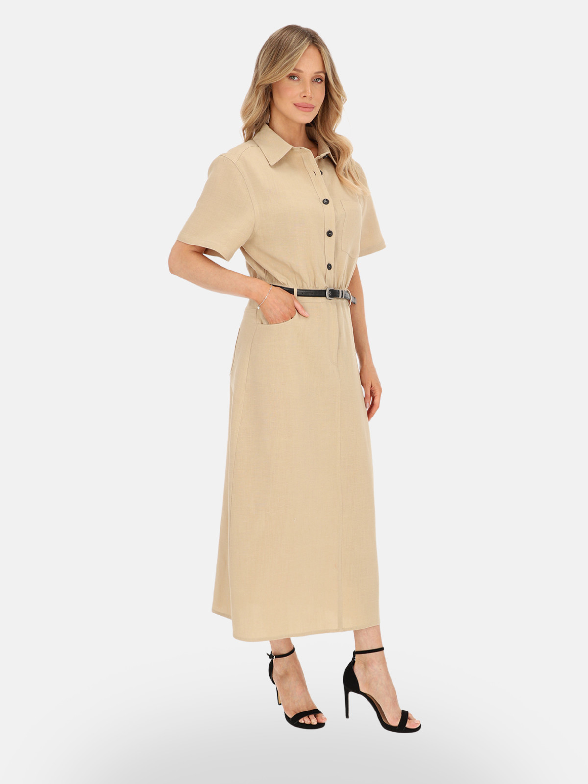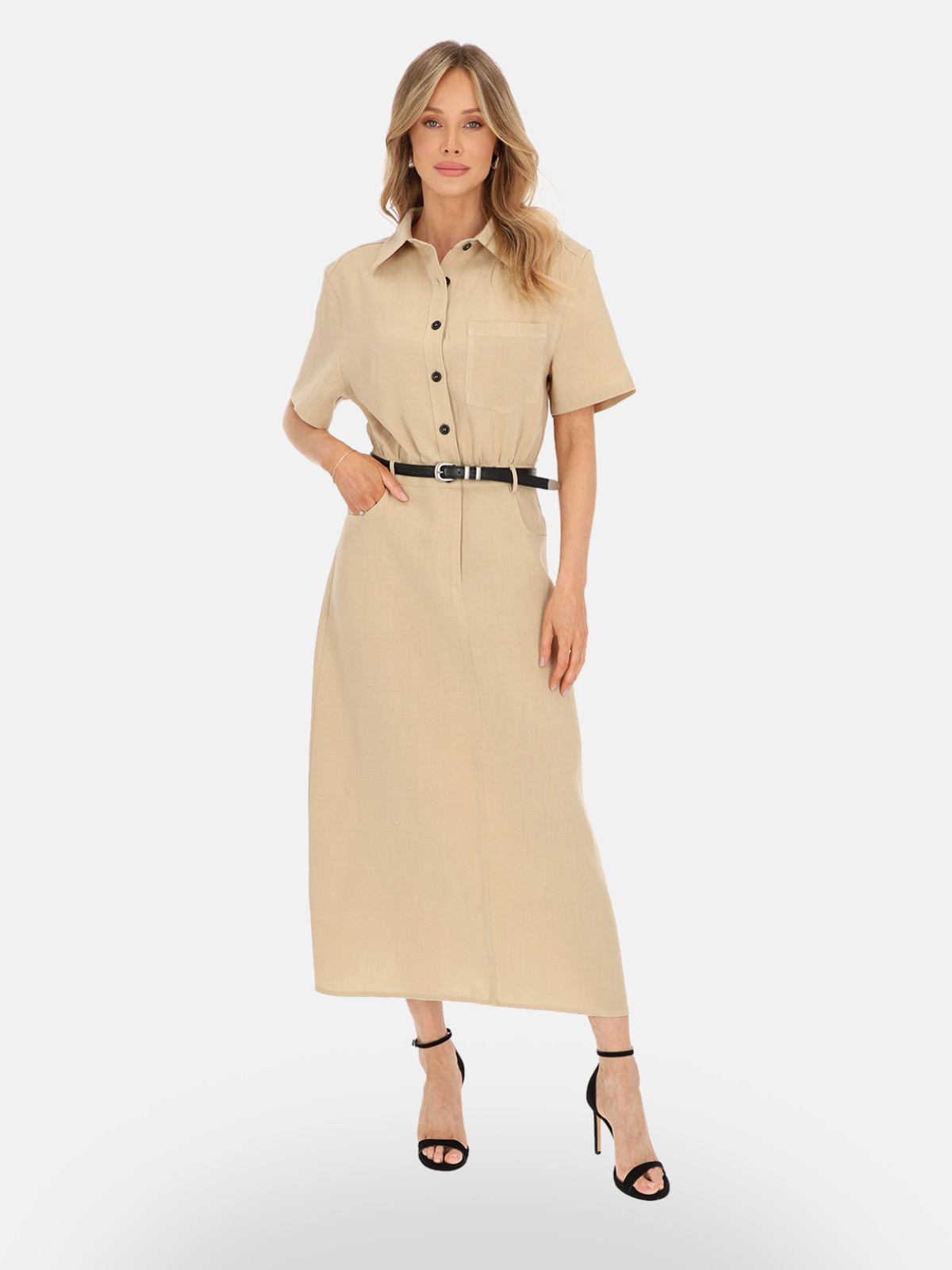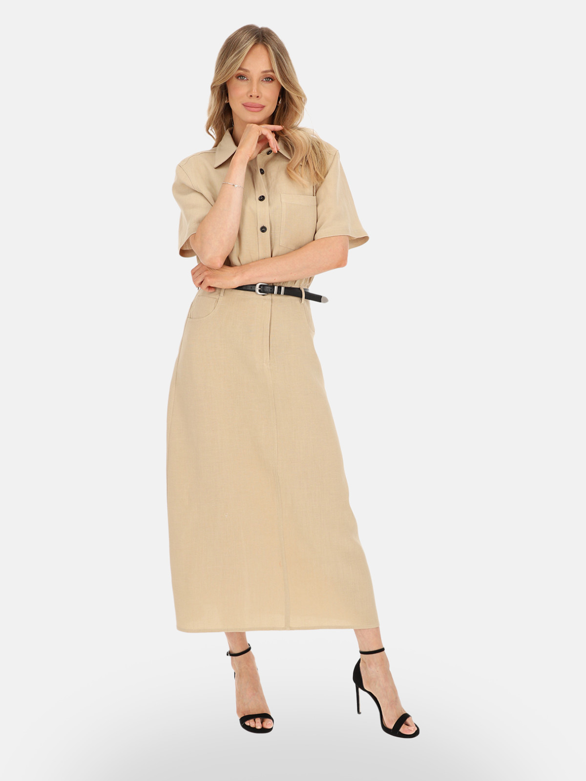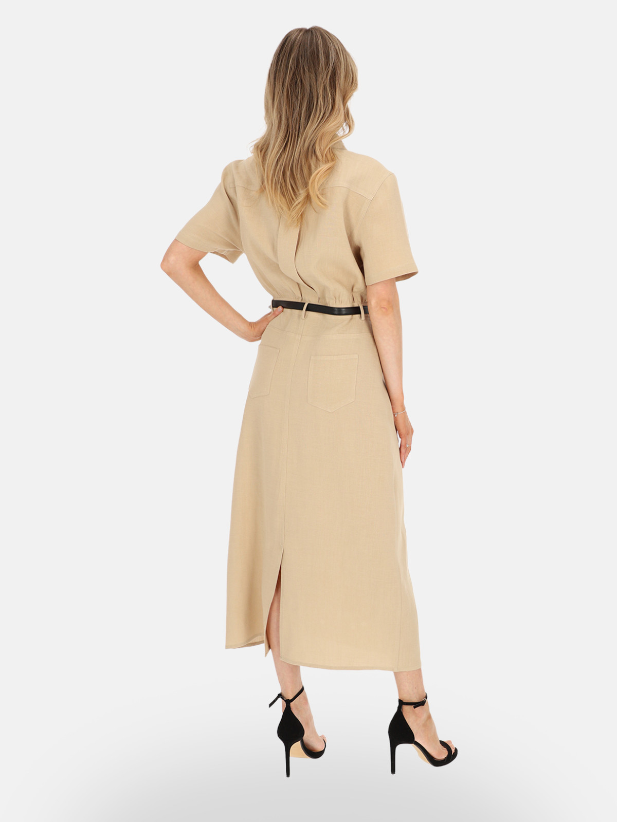 Dzięki swojej estetyce sukienka Febi świetnie wpisuje się w styl safari i casual chic. Doskonale wygląda w połączeniu ze szpilkami lub sandałami na obcasie – jak na zdjęciach – ale równie dobrze sprawdzi się w bardziej swobodnych zestawieniach z balerinami, espadrylami lub sneakersami. Można ją uzupełnić skórzanym paskiem, torebką w odcieniach brązu lub złotą biżuterią.