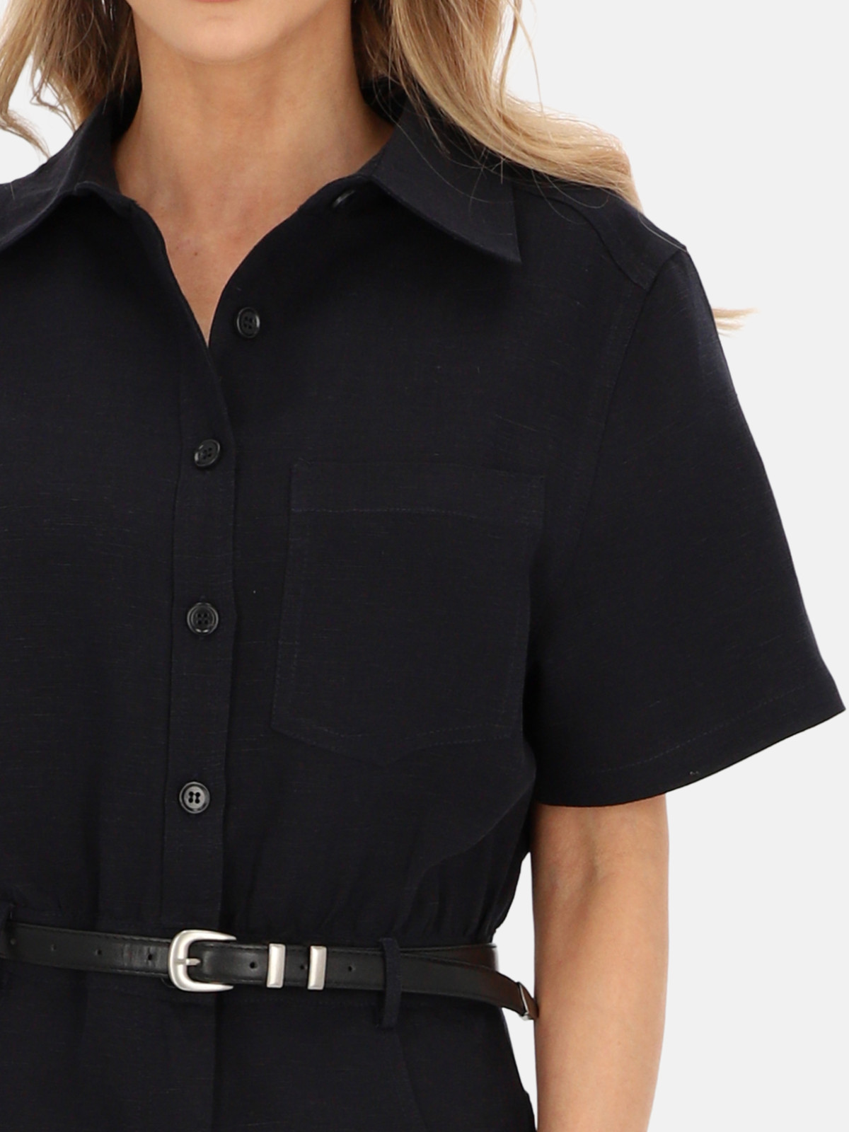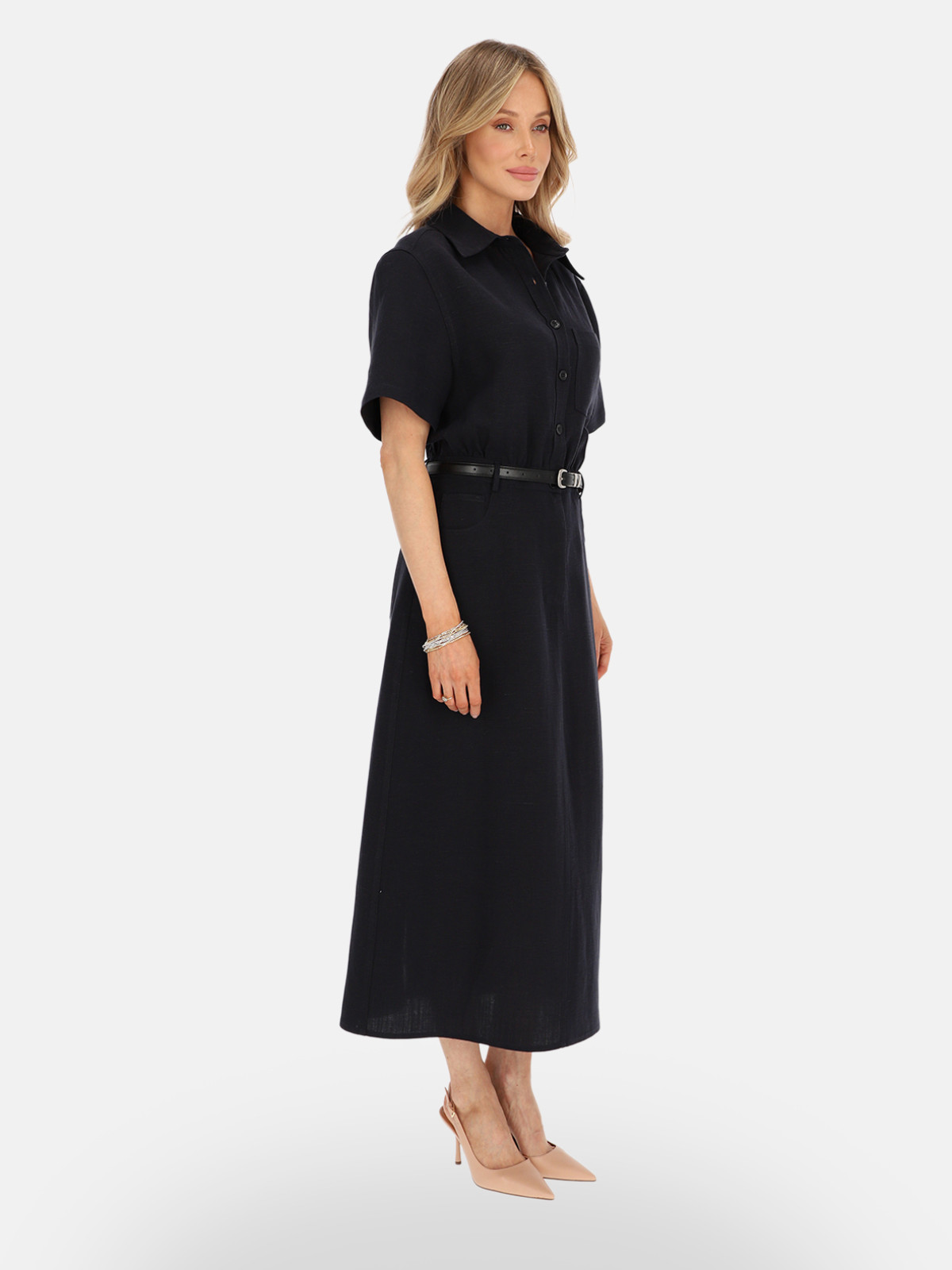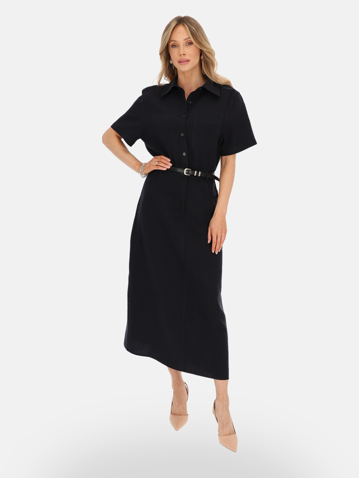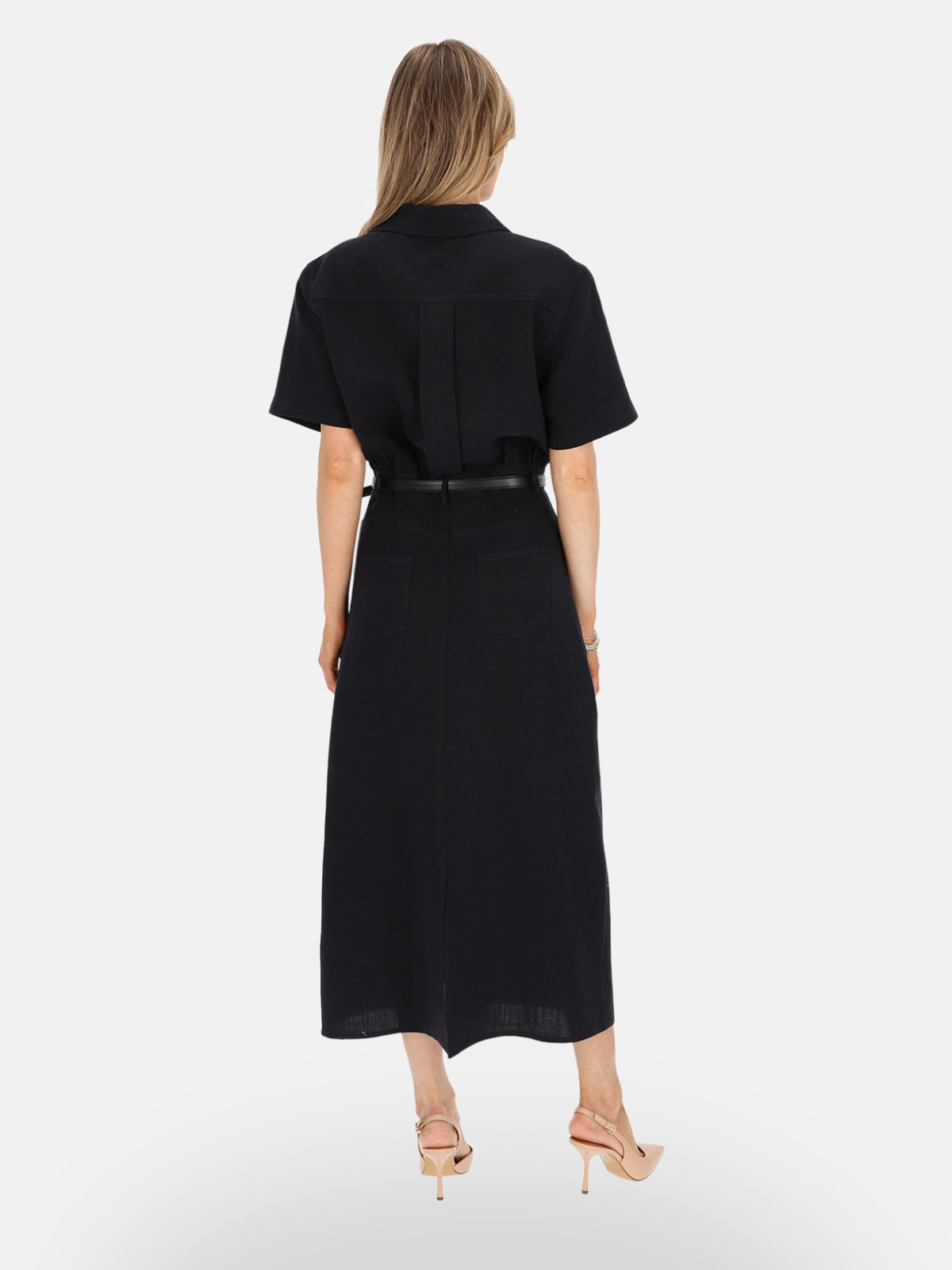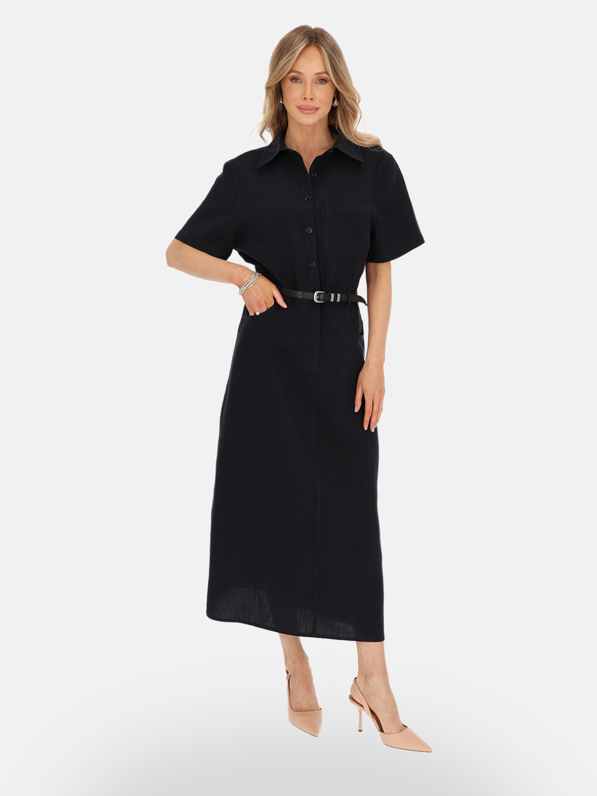 Model ma długość midi oraz prosty, lekko dopasowany krój, który subtelnie podkreśla sylwetkę. Góra sukienki nawiązuje do klasycznej koszuli – posiada kołnierzyk oraz zapięcie na guziki na całej długości, co dodaje jej uniwersalnego charakteru. Krótkie rękawy zapewniają komfort noszenia w cieplejsze dni. W talii zastosowano szlufki oraz cienki pasek z klamrą, który pozwala podkreślić pas i dopasować sukienkę do sylwetki. Dodatkowym atutem są praktyczne kieszenie oraz delikatne rozcięcie z tyłu, które zwiększa swobodę ruchów i dodaje lekkości całej formie.