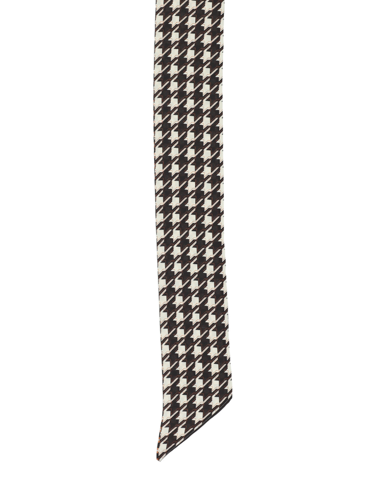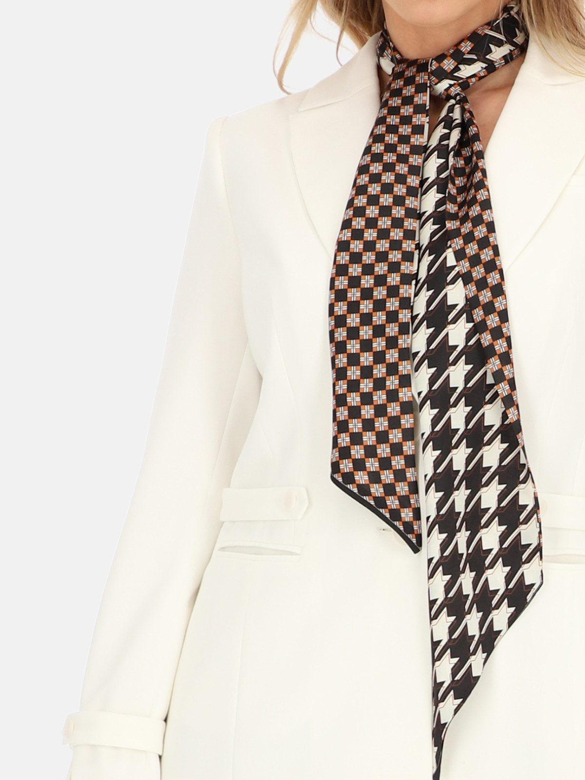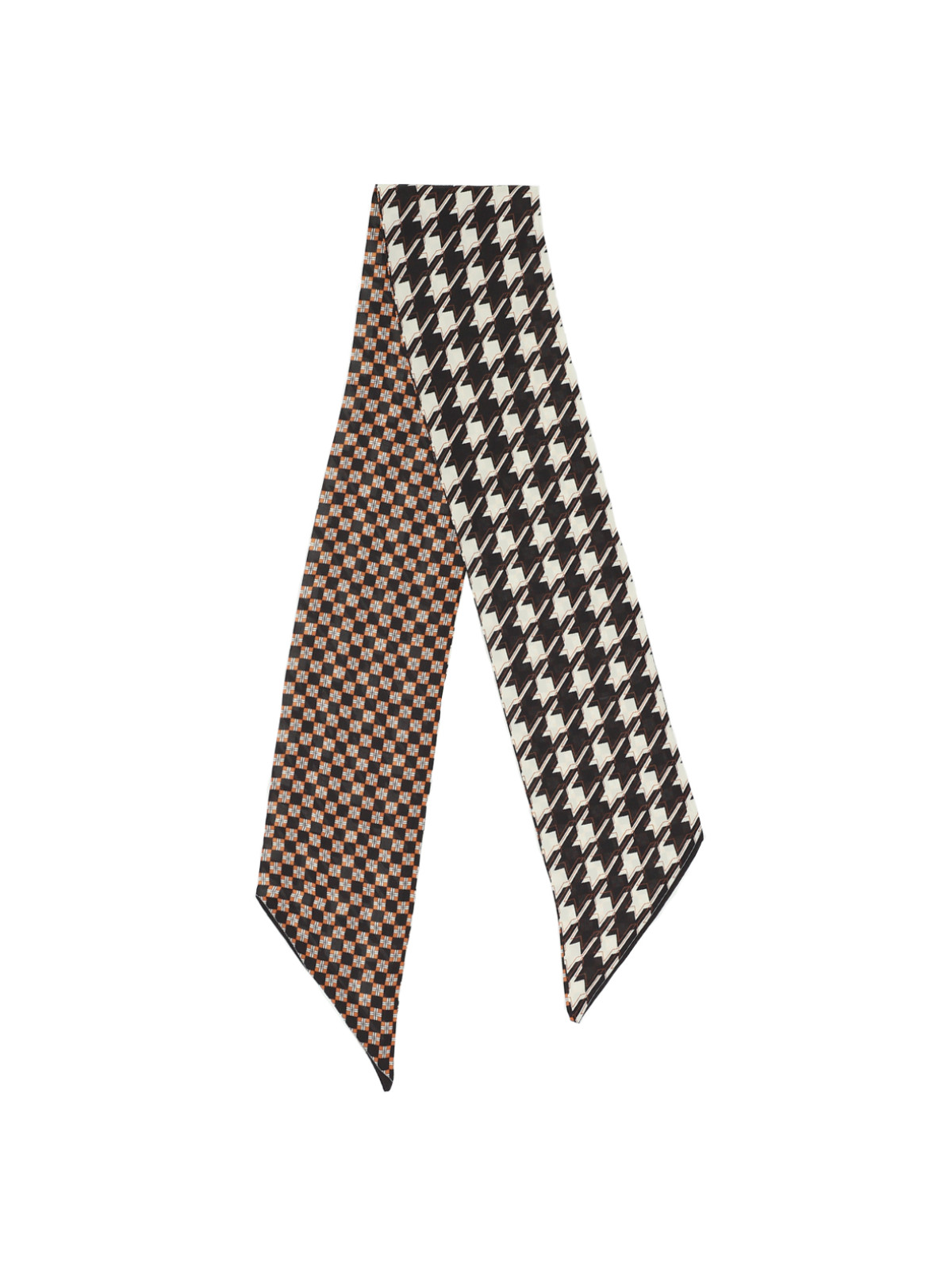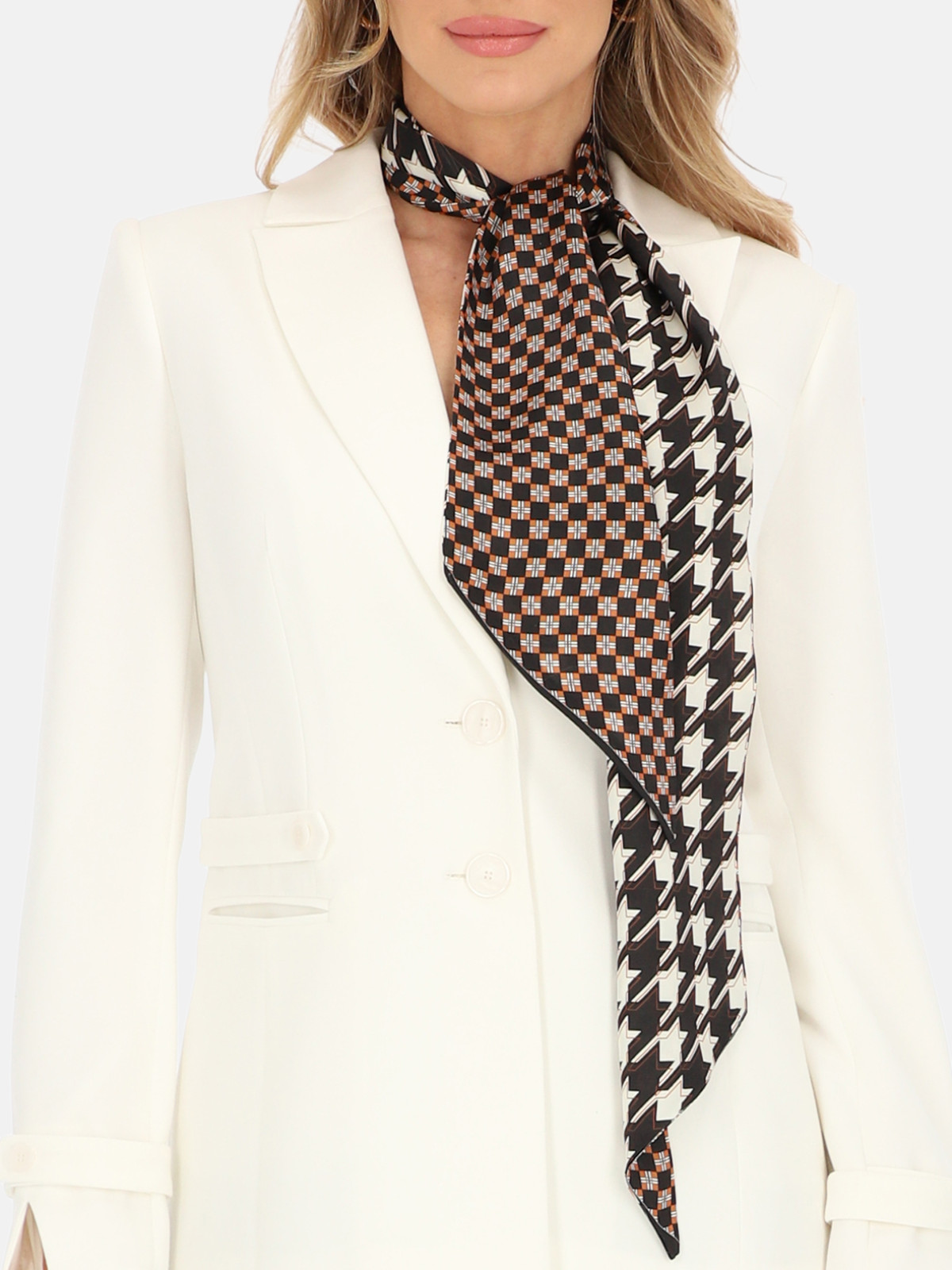 Wąska apaszka krawat Potis & Verso to elegancki dodatek, który nadaje stylizacji modowego charakteru. Model wyróżnia się efektownym, dwustronnym wzorem – z jednej strony klasyczna pepitka w kontrastowych barwach, z drugiej geometryczny deseń w odcieniach czerni i karmelu.